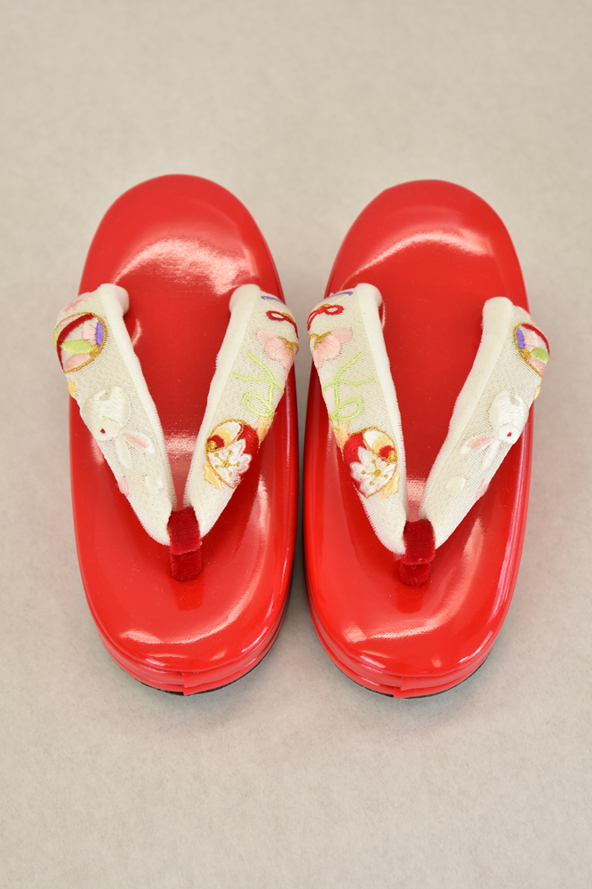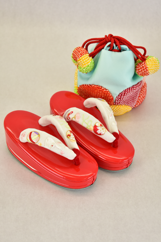 花緒には、打ち出の小づち、鞠、さくらなど…たっぷりと刺繍が施されているので、七歳用のお草履に挿げ替えて七歳のお祝いの時にもご活用いただけます♡