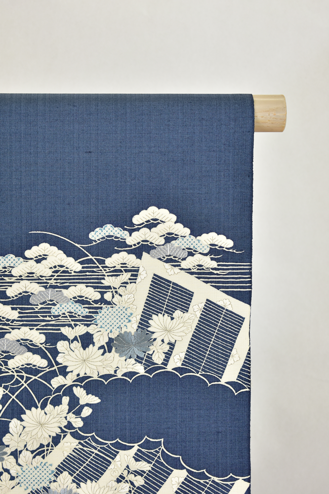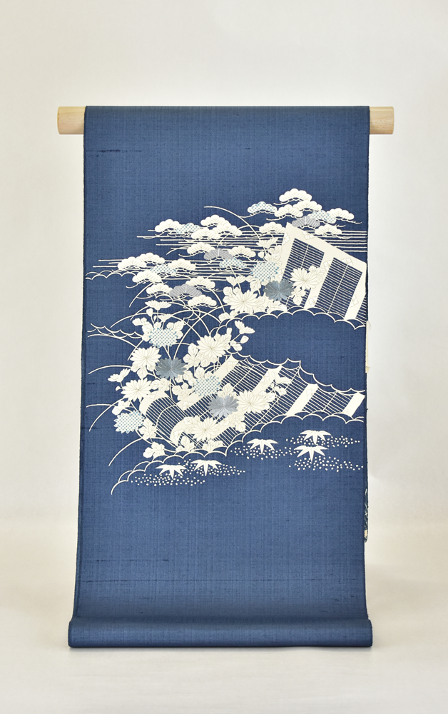お太鼓には「御簾」が描かれ、時代の流れや優雅な文化を彷彿とさせてくれる、優雅な絵が描かれています。多色を使うことなく、すっきりと仕上げられている「御簾に御所解」のデザインは小阪さんならではの洗練された逸品です。
