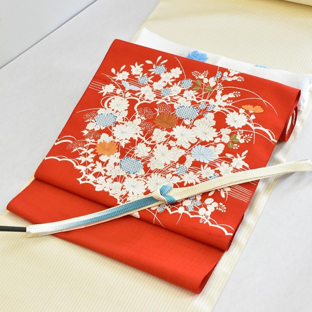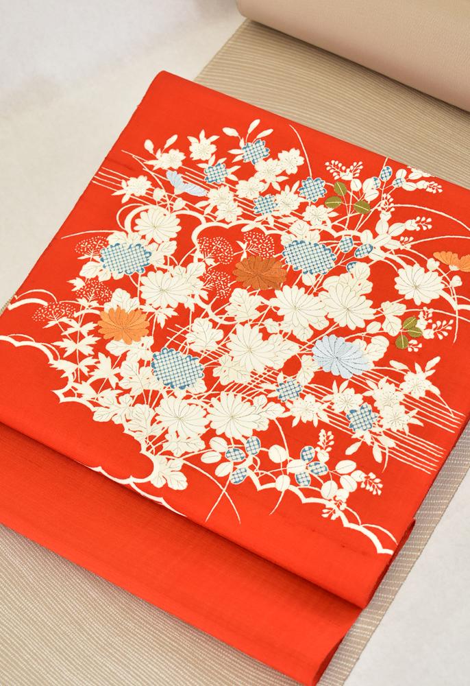お太鼓には桜、菊、萩、女郎花などのたっぷりと描かれた草花の文様。