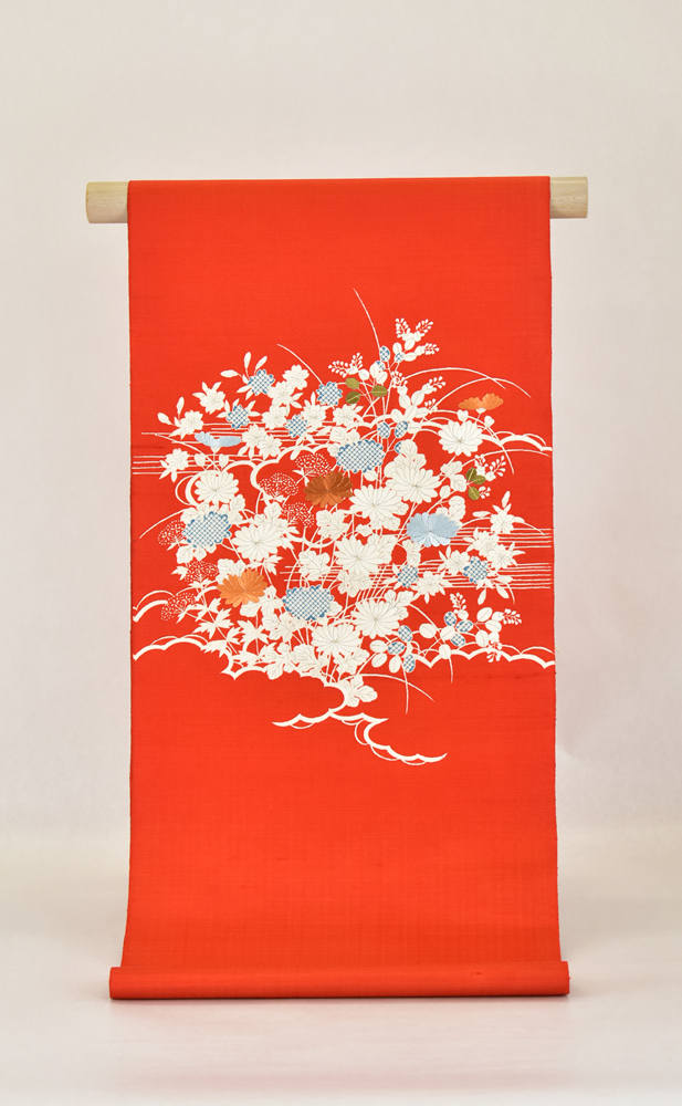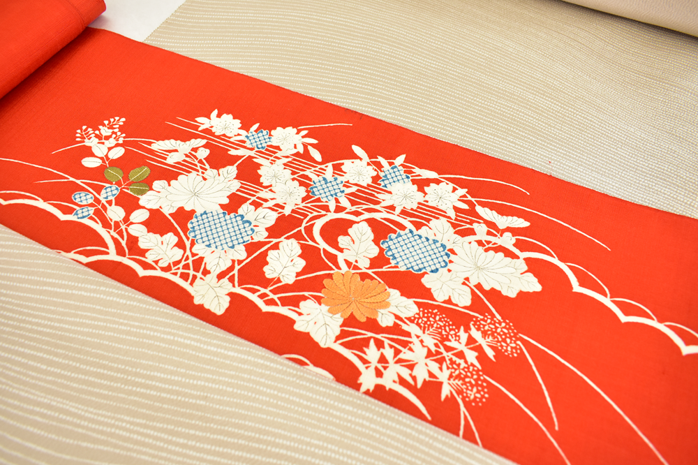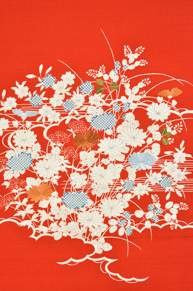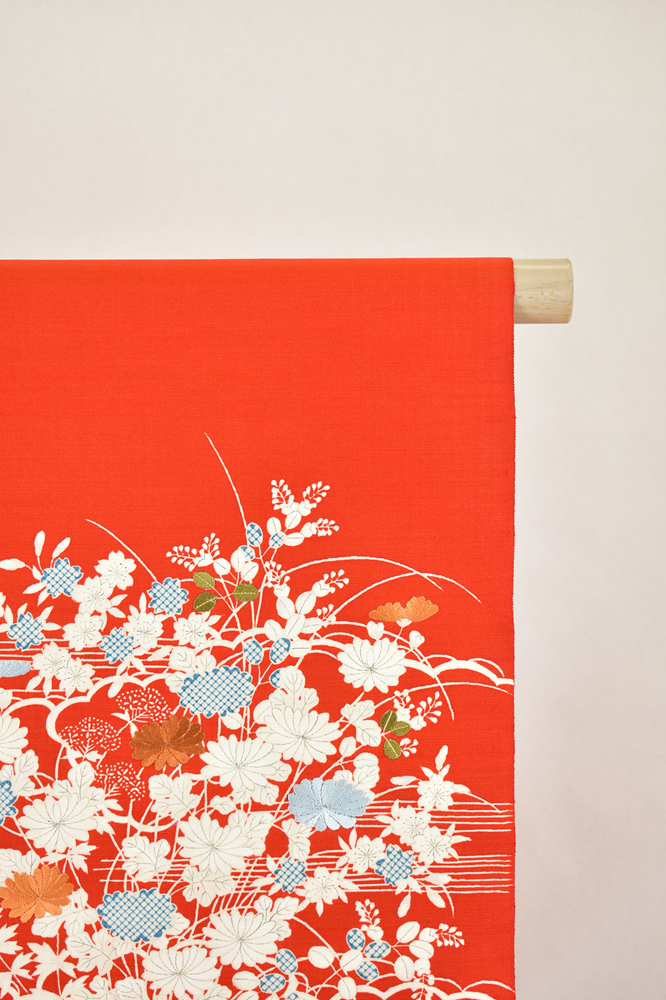 色数を抑えながら、朱の地色に刺繍の柿色、ブルーの差し色を合わせて表現される、