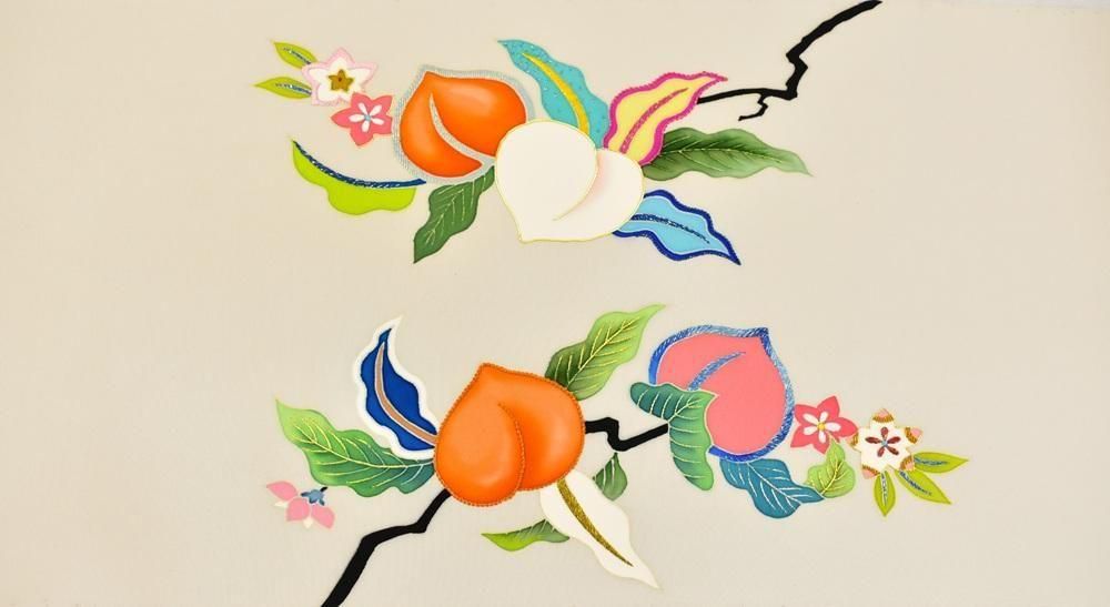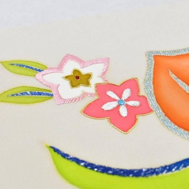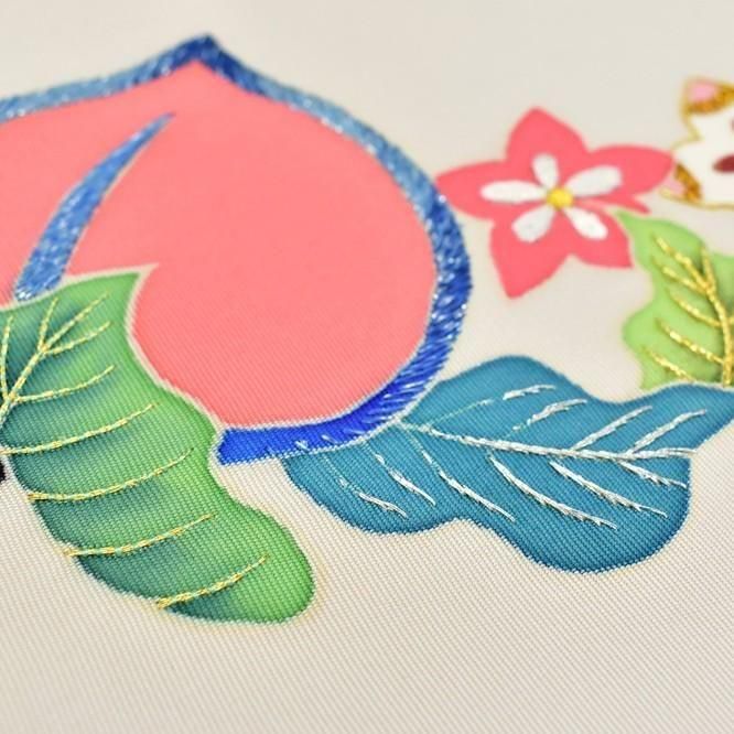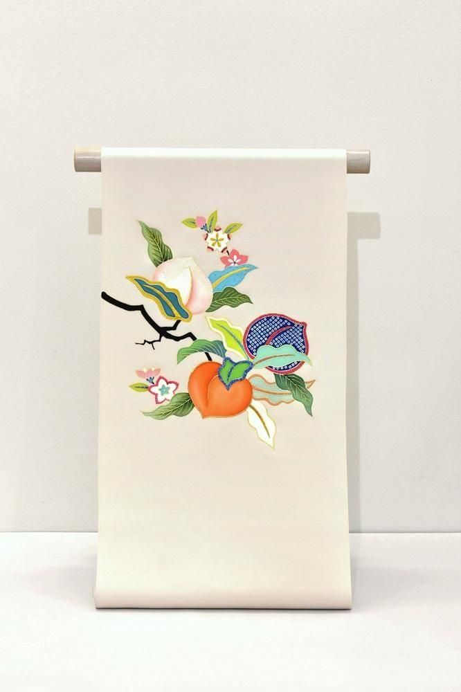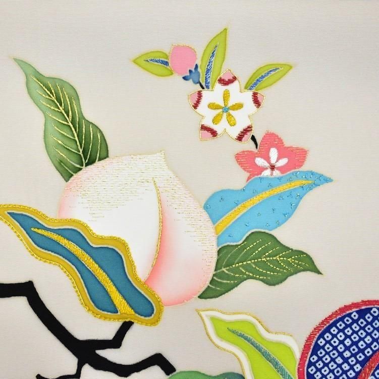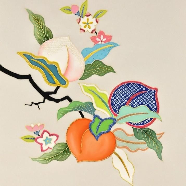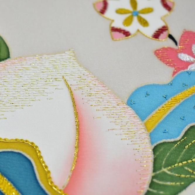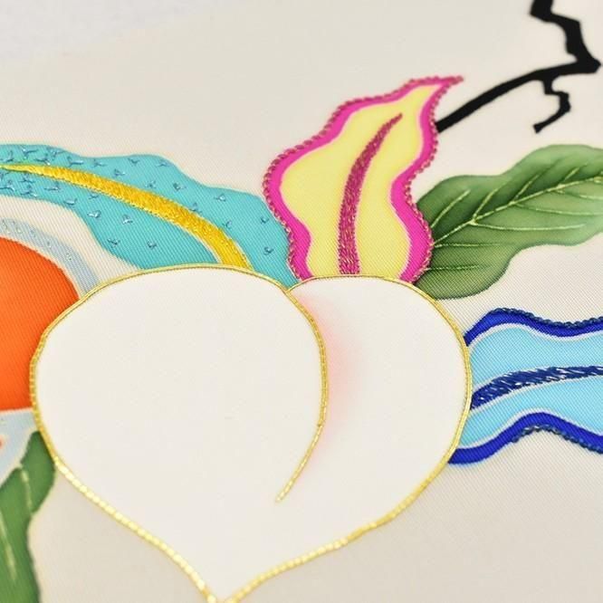 初めてお会いしたとは思えないほど、お話が弾む中、出来上がった大羊居制作名古屋帯「寿桃」。大迫力の名古屋帯となりました。細部に施された刺繍は大羊居ならではの存在感を放っています。いつまで見ていても見飽きることがない大作です。紬、小紋にとどまらず、附下までコーディネートしていただけます。