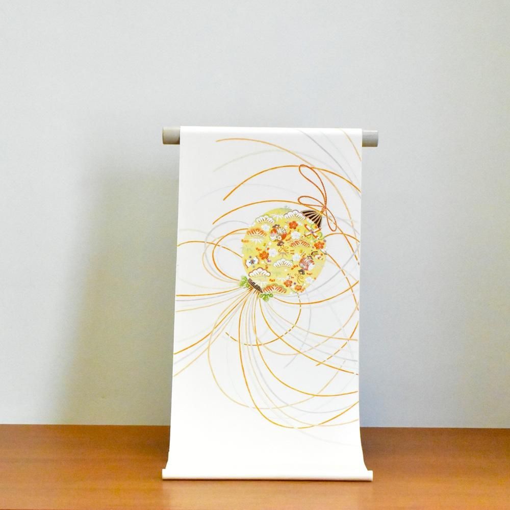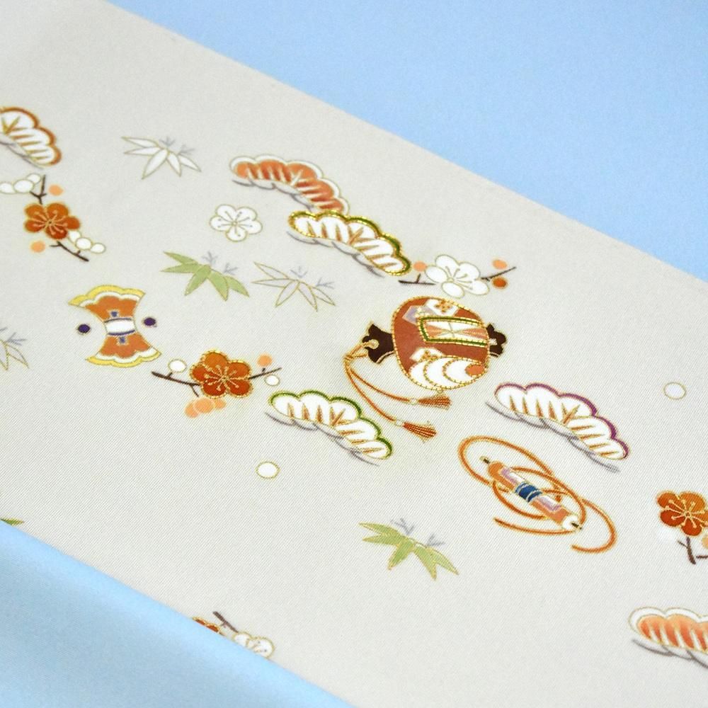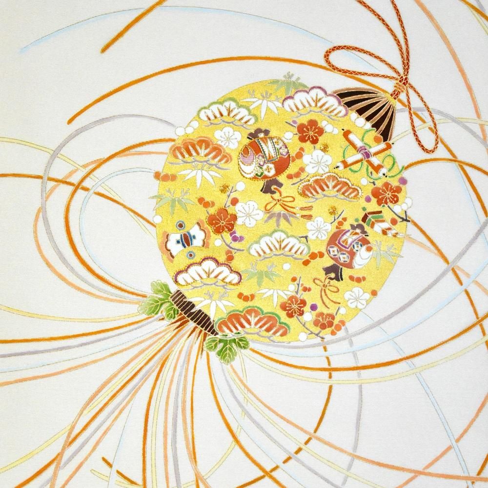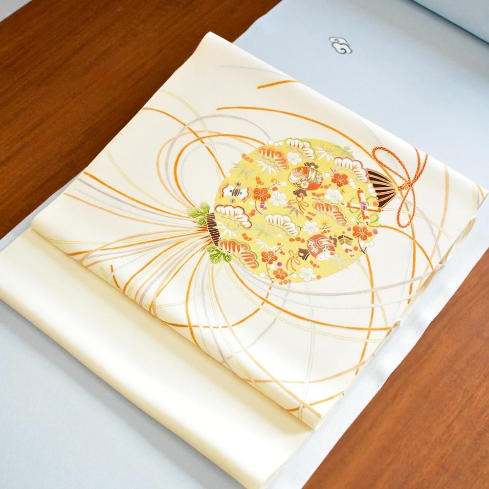 伸びやかで大きな薬玉の中に「宝尽くし文様」が描かれた初春にふさわしい柄の名古屋帯のご紹介です。おめでたい文様に鮮やかな色が使われ、華々しい印象。