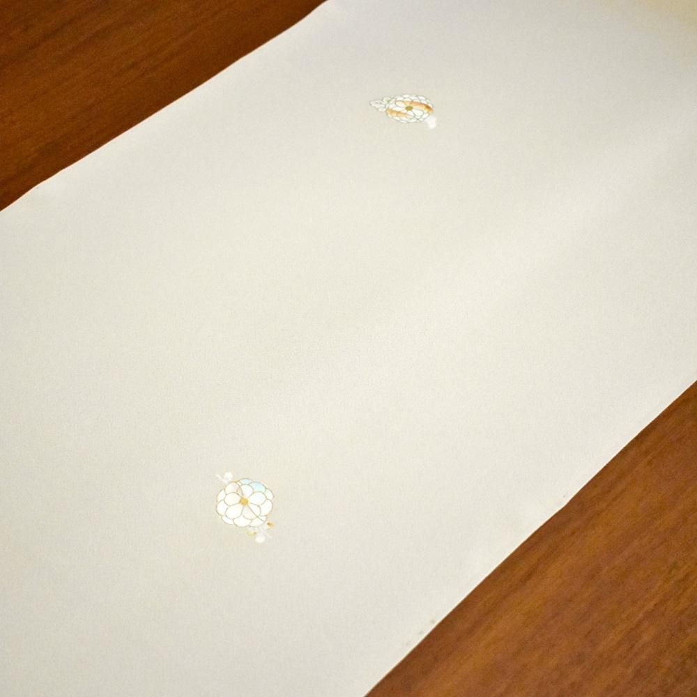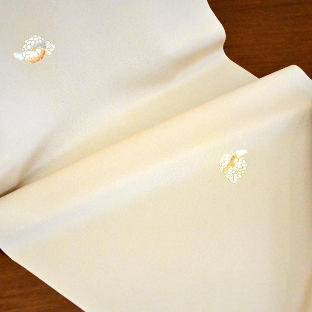 お肌なじみの良い象牙色の地色に愛らしい丸みを帯びた菊と梅の文様。